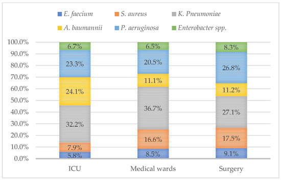 The distribution of collected specimens according to wards is shown in Figure 2. Most of the specimens were from ICUs (21.5%), the Internal Medicine Unit (16.6%), and the General Surgery Unit (10.0%). A smaller proportion of specimens came from the Infectious Diseases Unit (4.9%) and other unspecified wards (6.9%).
