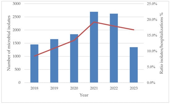 Absolute frequencies of microbiological isolates from 1 January 2018 to 6 July 2023 and ratios of isolates to admissions expressed as percentages.