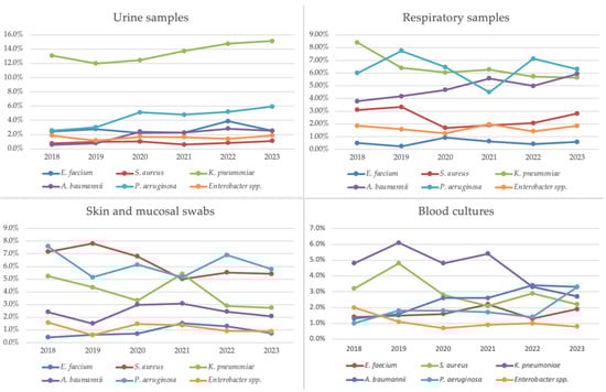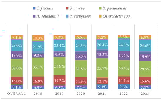 We conducted a single-center retrospective observational study. Microbiological data from all specimens collected at the University Hospital Paolo Giaccone in Palermo between 1 January 2018 and 6 July 2023 were retrieved from an institutional anonymized electronic microbiological information system. A total of 11,607 specimens from 4916 patients were collected. The specimens included blood, respiratory secretions, urine, biopsies, bile, cerebrospinal fluid, serous fluids, feces, skin and mucosal swabs, and others. Only isolates of ESKAPE pathogens were considered for inclusion in the study. Patient records included age, sex, bacterial isolates, hospital ward, and antimicrobial susceptibility patterns. Susceptibility test results were interpreted according to the European Committee on Antimicrobial Susceptibility Testing (EUCAST) criteria relevant to each year of the study period []. Resistance to ampicillin, vancomycin, teicoplanin, gentamicin, linezolid, and imipenem were reported for E. faecium. Resistance to oxacillin, vancomycin, teicoplanin, gentamicin, linezolid, daptomycin, trimethoprim-sulfamethoxazole, clindamycin, tetracycline, and moxifloxacin was reported for S. aureus. The Minimum Inhibitory Concentration test (MIC values > 2 mg/L) for oxacillin was used to determine methicillin resistance in S. aureus isolates. Resistance to amoxicillin-clavulanic acid, ceftazidime, piperacillin-tazobactam, cefepime, ceftolozane-tazobactam, meropenem, imipenem, ertapenem, ceftazidime-avibactam, meropenem-vaborbactam, trimetoprim-sulfamethoxazole, ciprofloxacin, gentamicin, and colistin was reported for K. pneumoniae. Resistance to meropenem, imipenem, trimethoprim-sulfamethoxazole, ciprofloxacin, gentamicin, and colistin was reported for A. baumannii. Resistance to ceftazidime, piperacillin-tazobactam, cefepime, ceftolozane-tazobactam, meropenem, imipenem, ceftazidime-avibactam, ciprofloxacin, tobramycin, and colistin was reported for P. aeruginosa. Resistance to ciprofloxacin, colistin, cefepime, amoxicillin-clavulanic acid, gentamicin, ertapenem, imipenem, meropenem, trimetoprim-sulfamethoxazole, ceftazidime, ceftazidime-avibactam, ceftolozane-tazobactam, meropenem-vaborbactam, and piperacillin-tazobactam was reported for Enterobacter spp. In addition, cefiderocol was tested in 46 cases of Gram-negative ESKAPE isolates. Phenotypic resistance to meropenem and/or imipenem was used to determine the prevalence of carbapenem resistance. The data used in this study were collected through a Business Intelligence system, Biwer, developed by Werfen []. By leveraging a native integration with the microbiology laboratory’s information system, advanced data acquisition was achieved. The same microbial isolate from the same specimen type of the same patient, collected within 7 days, was considered a duplicate and, therefore, excluded from the final extracted data. Multiple specimens could be included for each patient. We reported the prevalence of ESKAPE pathogens and antimicrobial resistance to the main antibiotics used in clinical practice annually, and trends were assessed over time. Wards of admission were classified into medical wards, ICUs, and surgical wards, and isolate types were categorized according to that classification. The correlation between isolate type and ward was evaluated.