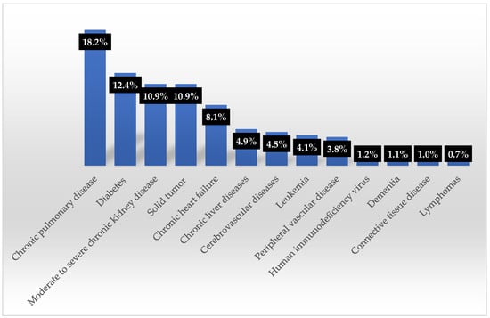 Mortality and comorbidity data from H-SDFs were available for 81.3% of the bacteremia cases (1353 out of 1663). The main comorbidities of the patients are depicted in Figure 10. The median age was 68 years (IQR 56–76), with 61.3% of the specimens from male patients. The median CCI was 3 (IQR 2–5), and the in-hospital mortality rate was 38.1%.