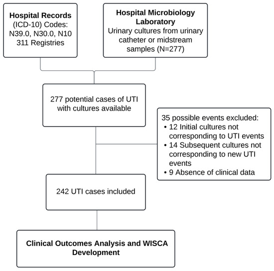 The WISCA model was designed based on pathogens isolated from patients with UTIs. As previously described, a UTI event was considered if the patient presented symptoms consistent with a clinical syndrome of UTI and had a positive urine culture upon admission. This process was independently conducted by two infectious disease specialists, and any discrepancies were discussed and resolved through consensus. If the isolated organism was susceptible to an empirical antibiotic, it was reported as susceptible to the empirical antimicrobial regimen employed. Organisms with intermediate susceptibility to a particular antimicrobial were classified as resistant for the model design. In cases where more than one microorganism was identified in the same urine culture, it was considered contaminated and was subsequently excluded from the model [55]. For patients with multiple subsequent urine cultures, it was verified that these patients experienced a new UTI event. Subsequent cultures taken during the initial UTI episode were excluded to avoid results influenced by pharmacological pressure. If they corresponded to a new UTI event, they were included in the analysis.