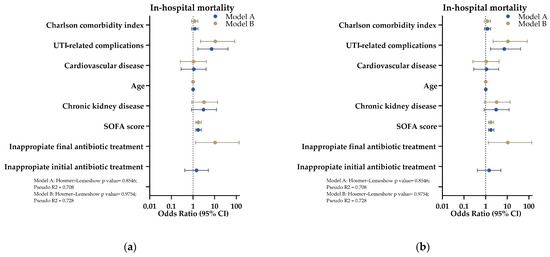 According to the multivariate logistic regression analyses regarding in-hospital mortality, two models were developed. Model A, which included inappropriate initial antibiotic treatment, identified higher SOFA scores (OR = 1.735, 95% CI: 1.348–2.396, p < 0.01) and the presence of complications related to urinary tract infection (OR = 7.207, 95% CI: 1.674–41.478, p < 0.05) as significant predictors of increased mortality, while the initial inappropriate antibiotic treatment was not significantly associated (OR = 1.439, 95% CI: 0.416–5.057, p = 0.563). Model B, which incorporated inappropriate final antibiotic treatment, revealed that inappropriate final antibiotic treatment was significantly associated with higher mortality (OR = 10.506, 95% CI: 1.311–135.265, p < 0.05), alongside elevated SOFA scores (OR = 1.719, 95% CI: 1.333–2.368, p < 0.01) and complications related to urinary tract infection (OR = 10.758, 95% CI: 2.218–84.270, p < 0.01). Both models demonstrated strong explanatory power (Pseudo R2 = 0.708 for Model A and 0.728 for Model B) and exhibited good fit (Hosmer–Lemeshow tests, p > 0.1 for both models). Figure 2a illustrates both models, while the complete set of variables for each model is provided in Table S4 of the Supplementary Materials.