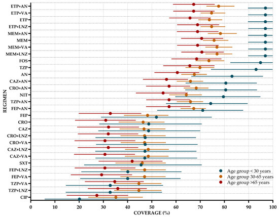 The coverage of regimens was studied according to local and international guidelines, including regimens for which automated sensitivity testing is routinely performed [55,56,57]. These regimens included fosfomycin (FOS), nitrofurantoin (NIT), trimethoprim/sulfamethoxazole (SXT), amikacin (AN), ciprofloxacin (CIP), piperacillin/tazobactam (TZP), ceftazidime (CAZ), ceftriaxone (CRO), cefepime (FEP), ertapenem (ETP), and meropenem (MEM). Additionally, combination therapies, including ceftazidime + amikacin (CAZ + AN), ceftriaxone + amikacin (CRO + AN), piperacillin/tazobactam + amikacin (TZP + AN), cefepime + amikacin (FEP + AN), meropenem + amikacin (MEM + AN), ertapenem + amikacin (ETP + AN), ceftazidime + linezolid (CAZ + LNZ) or vancomycin (CAZ + VA), ceftriaxone + linezolid (CRO + LNZ) or vancomycin (CRO + VA), piperacillin/tazobactam + linezolid (TZP + LNZ) or vancomycin (TZP + VA), cefepime + linezolid (FEP + LNZ) or vancomycin (FEP + VA), ertapenem + linezolid (ETP + LNZ) or vancomycin (ETP + VA), and meropenem + linezolid (MEM + LNZ) or vancomycin (MEM + VA), were studied.