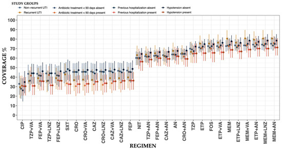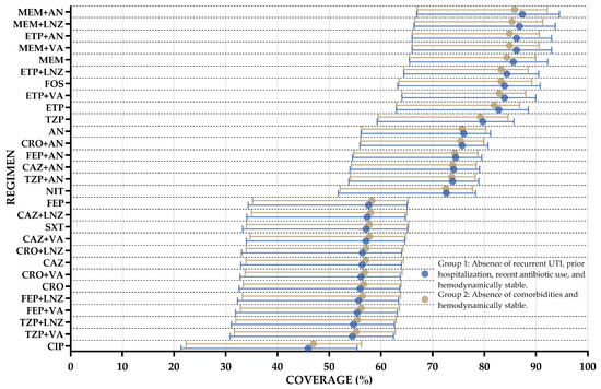 Finally, based on the previous results and to promote the rational use of antibiotics, two subgroups of patients were identified for the development of a specific WISCA. Group 1 consisted of patients without a history of recurrent UTI, prior hospitalization, or recent antibiotic use within 90 days, and who were hemodynamically stable. Group 2 included patients who were hemodynamically stable and did not have comorbidities. Overall, antibiotic coverage was higher in these subgroups, particularly for regimens that previously demonstrated lower coverage, such as piperacillin/tazobactam plus aminoglycoside (TZP + AN), ceftriaxone plus aminoglycoside (CRO + AN), and piperacillin/tazobactam (TZP). Of these subgroups, TZP + AN showed 73.85% coverage (HDI: 53.79–78.92%), CRO + AN reached 75.7% (HDI: 55.9–80.7%), and TZP exhibited improved coverage with a median of 79.7% (HDI: 59.3–85.7%). Despite the wide HDIs, these regimens demonstrated notable improvements in coverage compared to previous analyses. These findings suggest that these specific populations may benefit from regimens that were previously considered less effective, supporting the rational selection of antibiotics in targeted clinical scenarios. The full results are presented in Figure 6 and in Table S10 of the Supplementary Materials.