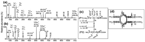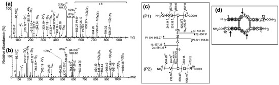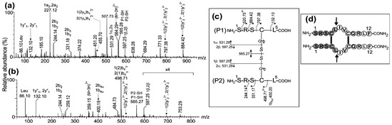 To confirm this assignment, the MS/MS spectra of the triple- and double-charged precursor ions detected at m/z 394.22 and m/z 590.82, respectively, were acquired (Figure 1a,b). The single-charged fragment ions detected at m/z 565.27 and m/z 618.34 (Figure 1a) were assigned to P1-SH and P2-SH due to the symmetric cleavage of the intermolecular disulfide bond between Cys4 and Cys8 generating the reduced peptides 1Ser-Leu5 and 6Ile-Arg10, respectively.