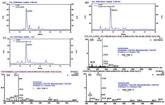Analytical RP-HPLC profile (Knauer system) and ESI-MS analysis of crude peptide CysCysCm-p5 after the liquid phase cyclization (1 mg/mL) with DMSO (20%) at pH = 3 (a,d) and after the on-resin cyclization with DMSO (35%), pH = 3, 3 h, and cleavage with a mixture containing EDT (b,e) or not (c,f). The m/z 711.40 (2+) and m/z 712.41 (2+) correspond to the expected m/z values for the (M+2H)2+ precursor ions of the linear and disulfide containing CysCysCm-p5, respectively.