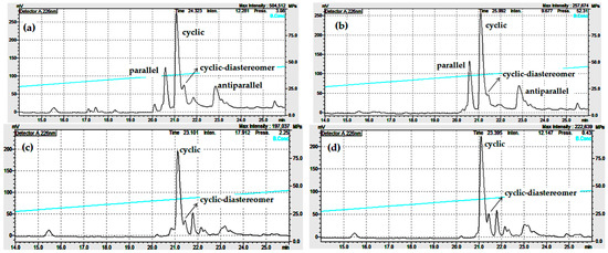 Finally, several experiments at 2 mg/mL of peptide showed shorter reaction times to yield mostly the antiparallel dimer in 5% EtOH or other organic solvents (Figure 8). Notably, at 1 mg/mL or more, insoluble material was present during cyclization, even in the presence of organic solvent. However, for the RP-HPLC analysis, the aliquots were solubilized by dilution to compare the chromatographic profiles and to ensure the completion of the reaction until the acyclic peptide was consumed.