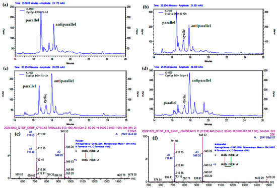Analytical RP-HPLC profile of the dimerization of CysCysCm-p5 at different EtOH concentrations: (a) 22% EtOH, (b) 45% EtOH, (c) 67% EtOH, (d) 81% EtOH, pH = 8, 12–24 h, 1 mg/mL. The percentual values over each chromatogram indicate the integrated relation between the parallel dimer, cyclic monomer, and antiparallel dimer. The m/z 711.40 (4+) and m/z 948.20 (3+) correspond to the expected m/z values for the (M+4H)4+ and (M+3H)3+ precursor ions of the parallel (e) and antiparallel (f) dimers of CysCysCm-p5, respectively.