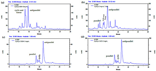 Analytical RP-HPLC profile of the cyclization of CysCysCm-p5 at 2 mg/mL: (a) 90% EtOH 6 h, (b) 90% EtOH 24 h, (c) 5% EtOH, (d) 5% ACN (12 h).