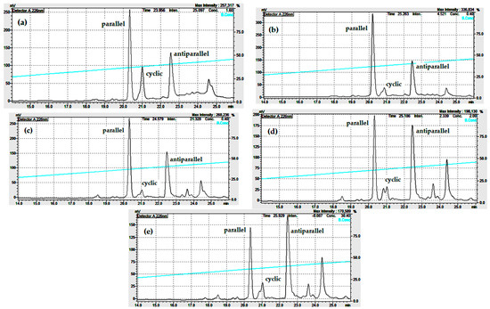 Analytical RP-HPLC profile (Shimatsu system) of the cyclization of the linear CysCysCm-p5 at 0.5 mg/mL and different EtOH concentration: (a) 5% EtOH, (b) 25% EtOH, (c) 50% EtOH, (d) 75% EtOH, (e) 90% EtOH, pH = 8, 12–24 h.