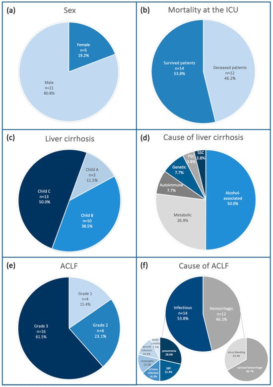 Clinical characteristics of the study population. Twenty-six patients with ACLF were included. All patients were diagnosed with liver cirrhosis and were treated at the ICU due to ACLF. (a): Distribution of sex; (b): Mortality in the ICU; (c): Liver cirrhosis measured by Child–Pugh Score; (d): Etiology of liver cirrhosis; (e): ACLF grade 1 to 3; (f): Causes of ACLF (PSC = primary sclerosing cholangitis, SSC = secondary sclerosing cholangitis SSC).