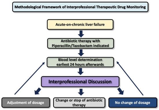 Pharmacodynamic alterations in ICU patients establish a link between pharmacokinetic exposure and the antimicrobial’s capacity to either inhibit or eradicate bacterial growth. Recent data have underscored the importance of TDM for antibiotics, specifically in relation to continuous versus intermittent infusion strategies, with Piperacillin/Tazobactam being a particular focus [18,19]. Existing studies have not fully explored the interprofessional management of TDM in patients with severe hepatic dysfunction. This gap is particularly significant for ACLF patients, a high-risk subgroup characterized by complexity and multi-organ involvement.