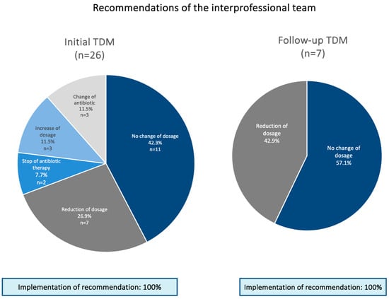 Following the initial TDM (therapeutic drug monitoring) assessment, the interprofessional team recommended a dose reduction for seven patients (26.9%), an increase in dosage for three patients (11.5%), and a switch to an alternative antibiotic for three patients (11.5%). For two patients (7.7%), the discontinuation of antibiotic therapy was advised. Only in 11 patients (42.3%) was no change of dosage recommended (Figure 4).