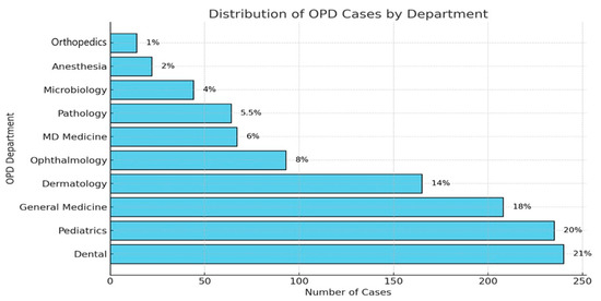 The dental OPD was the biggest source of prescriptions (21%), followed by pediatrics (20%), general medicine (18%), dermatology (14%), and gynecology (8%), as shown in Figure 2.