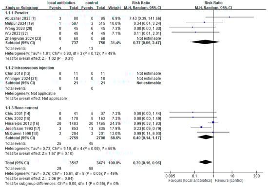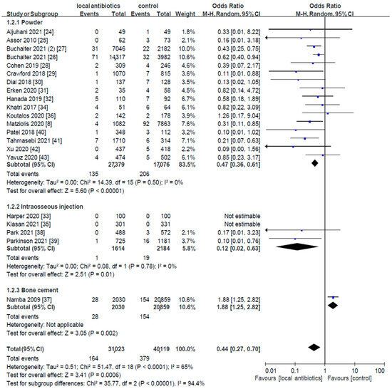 Chicago/Turabian StyleLin, Chia-Yu, Chiung-Li Liu, Hon-Lok Lo, Shao-Yuan Hao, Wei-Hsuan Huang, Hsiu-Mei Chang, and Tun-Chieh Chen. 2025. "Effectiveness of Local Antibiotics for Infection Prevention in Primary Joint Arthroplasty: A Systematic Review and Meta-Analysis" Antibiotics 14, no. 3: 214. https://doi.org/10.3390/antibiotics14030214