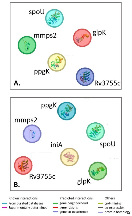 In summary, the spontaneous mutant clones resistant to aroylhydrazones MLT_FUR or VAL_SNN harbored mutations in the following genes: ppgK, mmpS2, glpK, Rv3755c, or spoU. Gene–gene network analysis revealed that these five genes are not connected (Figure 1A), meaning they are not linked to each other and are involved in different pathways. Furthermore, when inhA, which codes for the target of aroylhydrazones, was added to these genes, the network did not establish any connections between them (Figure 1B).