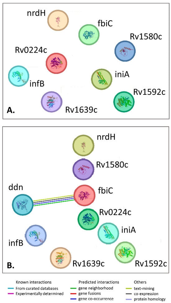 Gene–gene network of genes mutated in aroylhydrazone-resistant clones in vitro. (A) Network of five genes detected in this study. (B) The same network with added inhA, coding for a target of aroylhydrazones InhA. The network was built using STRING (https://string-db.org/cgi/about.3 (accessed on 30 January 2025)). Note the lack of connecting links between the genes, which reflects that the genes are not interacting, to the best of current knowledge.