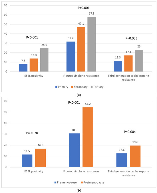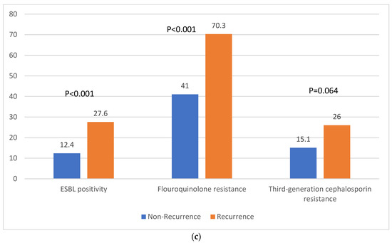 ESBL positivity, fluoroquinolone resistance, and third-generation cephalosporin resistance of E. coli according to clinical factors. (a) Hospital type, (b) menopausal status, and (c) recurrence of infection.
