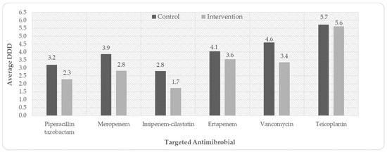 The average defined daily doses of targeted antimicrobials are presented in Figure 1. With the prospective audit and feedback process, the defined daily doses of the targeted antimicrobials were lower in the intervention group compared to the control group. The antimicrobials for which the defined daily doses increased with the intervention compared to the control group include cefdinir (5 vs. 5.71) and ciprofloxacin (5.5 vs. 7.2).