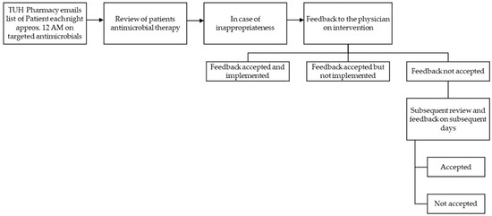The intervention was a prospective audit of antimicrobial prescriptions among inpatients in February 2024. The pharmacy department emails a list of patients on targeted antimicrobials each night (12 AM). As it is difficult to review all inpatients who were prescribed antibiotics, we have carefully selected the targeted list to include broad-spectrum and reserved antimicrobials [10]. These antimicrobials in the targeted list were piperacillin–tazobactam, meropenem, imipenem–cilastatin, ertapenem, vancomycin, and teicoplanin [24]. A comprehensive review of patients’ antimicrobial therapy was conducted daily, taking into account patients’ clinical status, organ functions, laboratory and radiological information, and antibiotic history. We followed the checklist for antibiotic review during the prospective audit and feedback, like the selection of antibiotics, dose optimization, intravenous to oral conversion, drug interactions, antibiotic streamlining, laboratory monitoring, discontinuation of antibiotics if not required, and appropriateness of duration. In case of antimicrobial inappropriateness, feedback was provided to the physician on intervention. The feedback was provided by meeting with the prescribers following a handshake approach. When the prescriber was off duty, feedback was communicated via phone call or through the ward general practitioner. If intervention is not accepted or accepted but not implemented, subsequent review and feedback on subsequent days are conducted. The prospective audit and feedback process adopted is detailed in Figure 2 [25]. All the patients alerted by the pharmacy were included in the analysis except long-term care, neonates, and pediatric patients. These patient categories are excluded because their inclusion could have negatively impacted the outcomes monitored in the study. The antimicrobial use measure of defined daily doses cannot be applied to pediatric and neonates [25]. Similarly, when applying the length of stay as an outcome measure, combining acute care and long-term care patient groups is not appropriate.
