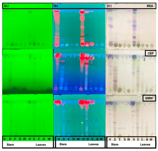 Phytochemical TLC fingerprints of L. ocymifolia extracts visualized using UV light at 254 nm (A), 365 nm (B) and vanillin-sulphuric acid spray (C). Key: H—hexane, D—dichloromethane, E—ethyl acetate, B—butanol, and W—water; EMW—ethyl acetate, methanol, water, CEF—chloroform, ethyl acetate, formic acid; and BEA—benzene, ethanol ammonium hydroxide.