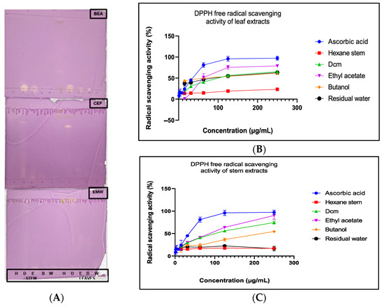 Chromatograms of L. ocymifolia extracts developed in BEA, CEF, and EMW mobile phases and sprayed with 0.2% DPPH solution (A) and quantitative free radical scavenging activity of leaf (B) and stem (C) extracts. BEA: benzene, ethanol, ammonia, CEF: chloroform, ethyl acetate, formic acid, EMW: ethyl acetate, methanol, water, H: hexane, D: dichloromethane (DCM), E: ethyl acetate, B: butanol, and W: water.