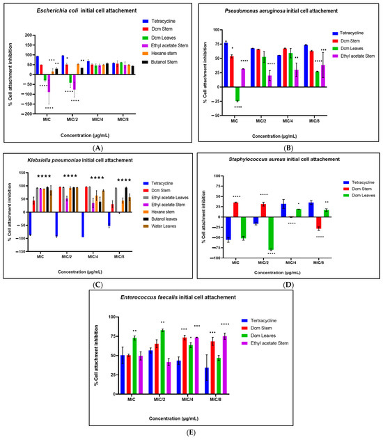 Prevention of cell attachment by the test extracts for E. coli (A), P. aeruginosa (B), K. pneumoniae (C), S. aureus (D), and E. faecalis (E). Data are presented as the mean ± standard deviation of duplicate experiments. One-way ANOVA coupled with Dunnett’s multiple comparisons test was used. A significant difference was observed when (*): p < 0.05, (**): p < 0.01, (***): p < 0.001, and (****): p < 0.0001.