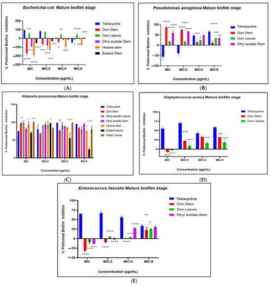 Eradication of preformed biofilm by the test extracts against E. coli (A), P. aeruginosa (B), K. pneumoniae (C), S. aureus (D), and E. faecalis (E). Data are presented as the mean ± standard deviation of duplicate experiments. One-way ANOVA coupled with Dunnett’s multiple comparisons test was used. A significant difference was observed when (*): p < 0.05, (**): p < 0.01, (***): p < 0.001, and (****): p < 0.0001.