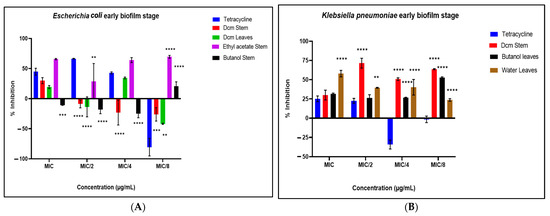 The effect of selected sub-MIC concentrations of extracts on the metabolic activity of E. coli (A) and K. pneumoniae (B) during the early biofilm-forming phase. Results are presented as mean ± standard deviation of duplicate experiments. One-way ANOVA coupled with Dunnett’s multiple comparisons test was used. A significant difference was observed when (**): p < 0.01, (***): p < 0.001, and (****): p < 0.0001.
