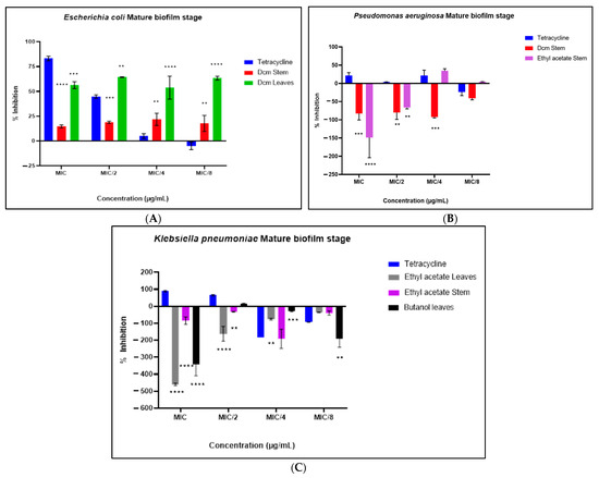 The effect of selected sub-MIC concentrations of extracts on the metabolic activity of E. coli (A), P. aeruginosa (B), and K. pneumoniae (C) during the eradication of preformed biofilms. Results are presented as mean ± standard deviation of duplicate experiments. One-way ANOVA coupled with Dunnett’s multiple comparisons test was used. A significant difference was observed when (**): p < 0.01, (***): p < 0.001, and (****): p < 0.0001.