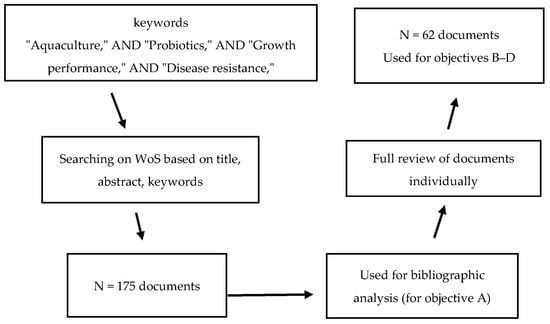 A thorough investigation was conducted by examining the worldwide literature in the Web of Science (WoS) database. WoS was selected because of its reputation as the most comprehensive and widely used database of literature in the area of reviews and bibliometric analyses. The search was conducted using a combination of keywords including “aquaculture”, “probiotics”, “growth performance”, and “disease resistance”, with a time frame extending from 2008 to 2024. All documents originally written in English were included. In addition, all open access research articles or book chapters were included; however, other types of documents were excluded. The search yielded a substantial number of documents, which was 175 in total.