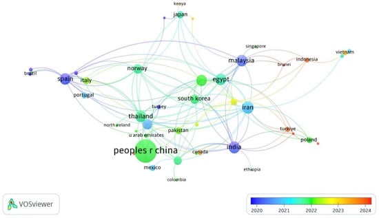 In total, 56 countries have published at least one research document on APGD based on the WoS database. In fact, 175 documents have been published by 57 countries. Asia was the leading continent for APGD-related documents, with co-authors of 85.1% of the documents published by the top 20 APGD countries (Table 1). China (nine total links) was the largest contributor with 56 APGD documents (Figure 2), representing around 32.3% of the total APGD documents published in the years 2008–2024 in the WoS database. In fact, China is the world’s largest producer of aquatic species, accounting for approximately 35% of the world’s fish and seafood production [28]. China’s aquaculture sector is characterized by its vast scale and diversity, producing more than 49,000,000 tons of fish in 2020. This diversity includes not only finfish but also mollusks and crustaceans, allowing for a wide range of products that cater to both domestic and international markets [28]. The top three contributors of APGD documents after China were Iran (15 documents), India (14 documents), and Malaysia (13 documents); the total links of these countries were 25, 22, and 17 for Iran, India, and Malaysia, respectively. The other leading countries with significant contributions to APGD documents were Spain, Thailand, Egypt, Bangladesh, the USA, Norway, Republic of Korea, Australia, Italy, Japan, Pakistan, Saudi Arabia, Poland, and Portugal, respectively (Table 1).