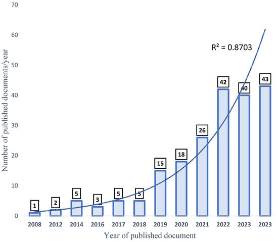 The total amount of documents published about the selected keywords (aquaculture, probiotics, growth performance, and disease resistance (APGD)) in the date range from 2008 to 2024 was 175. However, in one decade (between 2008 and 2018), only 19 documents (1–5 documents/year) were published about APGD, representing 10.98% of the total published documents. Later, a high increase in the publication rate (%/year) occurred, and the progress was exponential, which is justified by the high R2 value (0.9) (Figure 3). In 2019, the number of published documents was 13 (7.5%), while 15 (8.7%), 24 (13.9%), 37 (21.4%), 30 (17.3%), and 37 (21.4%) documents were published in the years 2019, 2020, 2021, 2022, 2023, and 2024, respectively. This rapid increase in the publication of scientific papers signifies a rapid response to address the importance of aquaculture, the rapidly growing human population, and food security-related issues. Projections indicate that, by the year 2050, the global population will be more than 9 billion, with a projected 85% increase in food production [29].