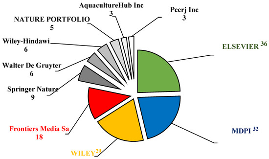 Elsevier and the Multidisciplinary Digital Publishing Institute (MDPI) were the most prominent academic publishers in aquaculture-related sciences. In this investigation, the top three publishers of APGD documents were Elsevier (36 documents), MDPI (32 documents), and Wily (30 documents) (Figure 4). These publishers played a vital role by publishing more than 58% of the total APGD documents published between 2008 and 2024. The dramatic increase in the research output by China has positioned it as a leading player in global academic publishing, including the publishing of studies related to aquaculture. China now exceeds the United States and any other nation in terms of its number of researchers and scientific publications, with a significant rise in the quality of these publications also being seen, as evidenced by their increasing number of citations in top-ranked journals [30]. MDPI has emerged as a major player in the publication of APGD documents and is particularly noted for its open access model, which allows for the rapid dissemination of research results. This is crucial in a field like aquaculture, where timely information can significantly impact practices and policies. For instance, a recent analysis highlighted a gradual increase in sustainable aquaculture publications, with a notable peak in 2023, indicating a growing interest and the need for accessible research in this area [31]. The open access nature of the MDPI journals ensures that research is readily available to practitioners and policymakers, facilitating the application of new findings in real-world settings.