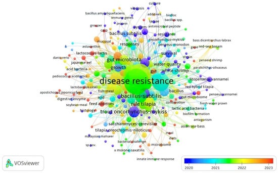 Similarly, the most significant author keywords were probiotics (62), aquaculture (30), immunity (24), probiotic (22), and growth performance (21). The total length strength of these keywords was 291, 154, 122, 109, and 108 for probiotics, aquaculture, immunity, probiotic, and growth performance, respectively (Table 3). The other keywords were disease resistance, growth, bacillus subtilis, Litopenaeus vannamei, gut microbiota, immune response, intestinal microbiota, intestinal health, gene expression, feed additives, Aeromonas hydrophila, and microbiota (Table 3, Figure 6). Based on the obtained results (Table 2), the keywords disease resistance (1793), probiotics (1348), aquaculture (1169), growth-performance (913), Bacillus subtilis (491), fish (482), and performance (456) yielded the highest length strengths, which can indicate that, between 2008 and 2024, the APGD documents focused on improving growth and disease resistance through the implementation of feed-based probiotics. Numerous studies have shown that overcrowding in intensive aquaculture systems can lead to stress in fish, making them more susceptible to infections and allowing pathogens to be more aggressive [32,33,34]. The stress induced by high stocking densities can compromise the immune systems of fish, increasing their vulnerability to diseases such as streptococcosis and viral infections [35]. However, probiotics are implemented for sustainable aquaculture purposes and to enhance growth parameters [20,21,22,36,37] or decrease the likelihood of disease outbreaks [22,25,38].