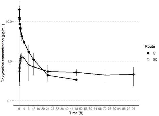 This report represents the first characterization of the disposition kinetics of doxycycline following both intravenous (IV) and subcutaneous (SC) administration in alpacas. Plasma concentrations exceeding the lower limit of quantification (LLOQ) were detected until the collection time points of 24 h and 96 h post-administration for IV and SC routes, respectively. The plasma concentration profiles of doxycycline following both IV and SC administrations are illustrated in Figure 1.