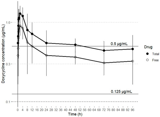 Concentration (mean ± SD) vs. time curve over 24 h for total drug doxycycline concentrations and estimated free drug doxycycline concentrations after subcutaneous administration of a single dose of 20 mg/kg. The lines represent target MICs of C. pseudotuberculosis (≤0.125 μg/mL) and R. equi (0.5 μg/mL).