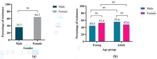 (a) The percentages of resistant E. coli isolates (out of 28 resistant isolates from a total of 100) among males and females from Qatari semi-wild Oryx leucoryx. Using SPSS statistical software, a higher percentage of resistance was detected among females than males, with 64.3% (n = 18/28) and 35.7% (n = 10/28), respectively. This difference was not statistically significant (p > 0.05). (b) Comparing the number of resistant E. coli isolates among different age groups and genders. The adult males showed a higher resistance percentage than adult females. ns: not significant.