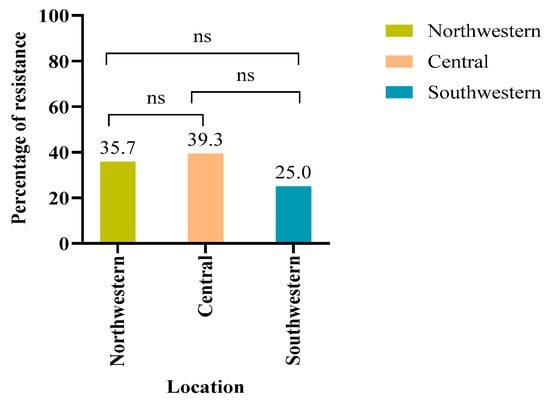 The percentages of resistant E. coli isolates across northwestern, central, and southwestern locations. The results did not show statistically significant differences. The highest percentage of resistance was detected in the central region. ns: not significant.