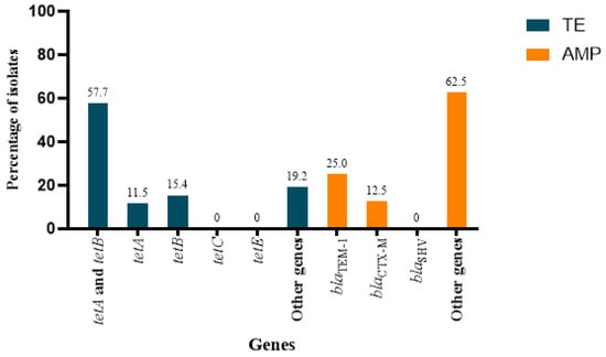 The percentage of genes associated with the phenotypic resistance to 2 antibiotics, tetracycline and ampicillin, was determined using gene-specific PCR. The “Other Genes” were determined using WGS and are listed in Table 2.