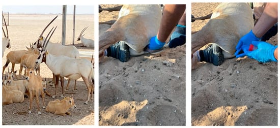 A full view of the studied Arabian Oryx along with two images depicting the sample collection process in this study.