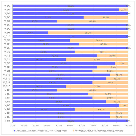 A score of “1” was assigned for each correct answer, while a score of “0” was given for incorrect or doubtful responses. Based on previous studies [67,68], a high level of knowledge was associated with a correct response rate above 82%, a moderate level with a correct response rate between 55 and 82%, and a low level of knowledge with a rate below 55%. Regarding good practices, the corresponding percentages were above 58%, between 35 and 58%, and below 35%. A positive attitude was defined by a correctness rate of more than 63%, while a negative attitude was associated with a correctness rate of less than 63%.
