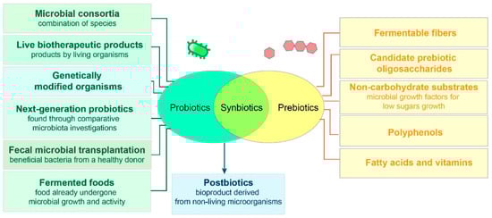 Probiotics are live beneficial microorganisms, most notably those belonging to the genera Bifidobacterium and Lactobacillus. Prebiotics are food components that support the growth of beneficial bacteria. Some, such as inulin or fructooligosaccharides, have already shown potential in clinical studies. The synergistic combinations of prebiotics and probiotics are known as synbiotics. Live therapeutics also include live biotherapeutic products, genetically modified organisms, fecal microbial transplants, and microbial consortia. Postbiotics, on the other hand, are bioactive compounds produced by probiotics (beneficial microorganisms) during metabolic processes. These compounds are typically non-living byproducts or metabolites, such as peptides, lipids, organic acids, polysaccharides, vitamins, antimicrobial peptides (AMPs), short-chain fatty acids, their derivatives, etc., which can have beneficial effects on human health [11,12].