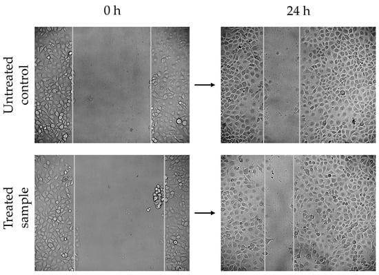 In vitro “wound-healing” assay on HaCaT cells treated with mucus fraction with MW > 20 kDa in comparison to the untreated control cells. Photographic images were taken on a Zoe Fluorescent Cell Imager (Bio-Rad).