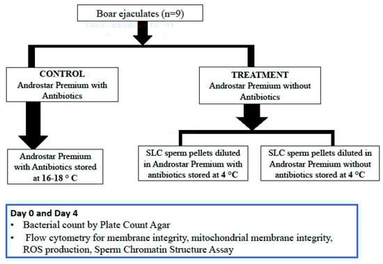 The purpose of this study was to compare the bacterial load and sperm quality in boar sperm samples in extenders with or without antibiotics stored at 4 °C for 4 days after SLC, with conventionally prepared samples, i.e., in extenders with antibiotics (controls) stored at 16–18 °C for the same period. The results showed that bacteria could be cultured from the conventional semen samples, even after 4 days of storage at 16–18 °C in the presence of antibiotics. However, the sperm quality was not adversely affected by the combination of SLC and cold storage, and some properties, such as chromatin integrity, were better in the cold-stored samples than in the conventionally stored samples. Bacterial counts (CFU/mL) between SLC samples and controls were not different; however, this may have been due to the small sample size. Further investigation with a larger sample size and additional breeds of boar is warranted.