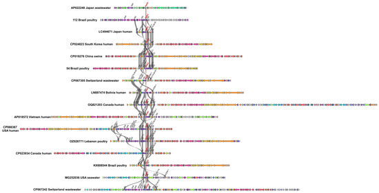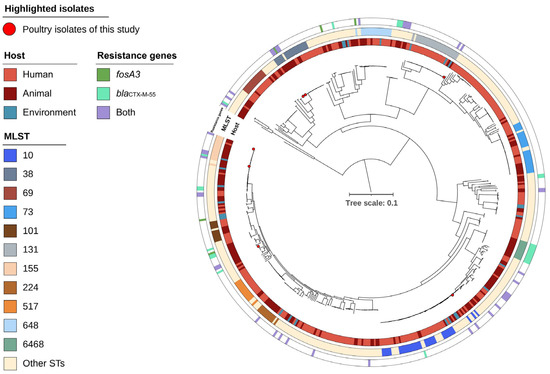 A separate phylogenetic analysis of Brazilian genomes (n = 444) demonstrated similar intermixing of human, animal, and environmental isolates, calling SNPs in 34% (1.86 Mb) of the reference genome. Some human isolates clustered closely with poultry isolates from this study; however, they lacked the fosA3 and blaCTX-M-55 co-carriage typical of poultry isolates (Figure 4).