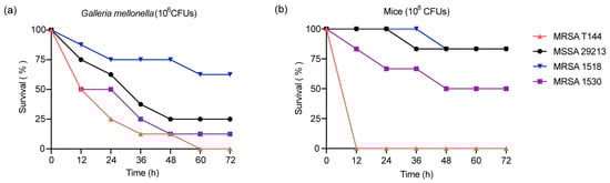 The virulence of MSSA 29213, MRSA T144, MRSA 1518, and MRSA 1530 was first assessed using the Galleria mellonella infection model. Galleria mellonella larvae were randomly divided into four groups (n = 8 per group) and infected with 10 µL of S. aureus suspension (1.0 × 106 CFUs) at the right posterior gastropod. The infected larvae were then maintained at 37 °C in a humidified incubator. Survival rates were monitored every 12 h for a total of 72 h. The survival rates of the larvae were recorded over a 72 h period. For the mouse peritonitis–sepsis model, female BALB/c mice (n = 6 per group) were infected with 1.0 × 108 CFUs of S. aureus suspension via intraperitoneal injection. Mice were observed every 12 h after infection. Health status was assessed based on activity level, respiratory rate, and appetite. Mortality was recorded as the primary endpoint. The survival rates of infected mice were monitored for 72 h. Mice were euthanized using a gradual-fill CO2 chamber. We followed the guidelines of the China Association for Laboratory Animal Science. CO2 was pre-administered into a transparent chamber. After 5 min, the mice were then placed inside the chamber. Subsequently, CO2 was introduced into the chamber for another 5 min. Once the cessation of movement and breathing in the mice was observed, the gas supply was stopped. The mice were monitored for an additional 2 min to confirm death.