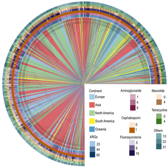 Moreover, we obtained a total of 1381 S. aureus genomes from the NCBI RefSeq database, among which 722 MRSA genomes were selected based on the presence of the mecA gene (Table S4). The whole genomes were aligned, and a phylogenomic tree was constructed. We found that MRSA T144 shares higher homology with MRSA strains from Asia. MRSA strains with similar homology to MRSA T144 primarily originate from various provinces in China, including Beijing, Shanxi, Hubei, Guangzhou, Zhejiang, and Taiwan. Furthermore, these samples were derived from diverse sources, including human, animal, food, and environmental samples. To highlight the distribution of antibiotic resistance genes across strains, a heatmap displaying the number of resistance genes in each strain is shown at the periphery of the evolutionary tree (Figure 2).