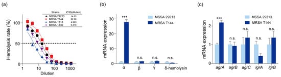 Hemolytic activity analysis of MRSA T144. (a) Hemolytic activity in RBC assay of four S. aureus strains. (b,c) The mRNA expression of four types of hemolysins and the related regulatory genes. Data are presented as means ± SD. Differences between two groups were determined by unpaired t-test and are denoted as follows: n.s.—not significant; *** p < 0.001.