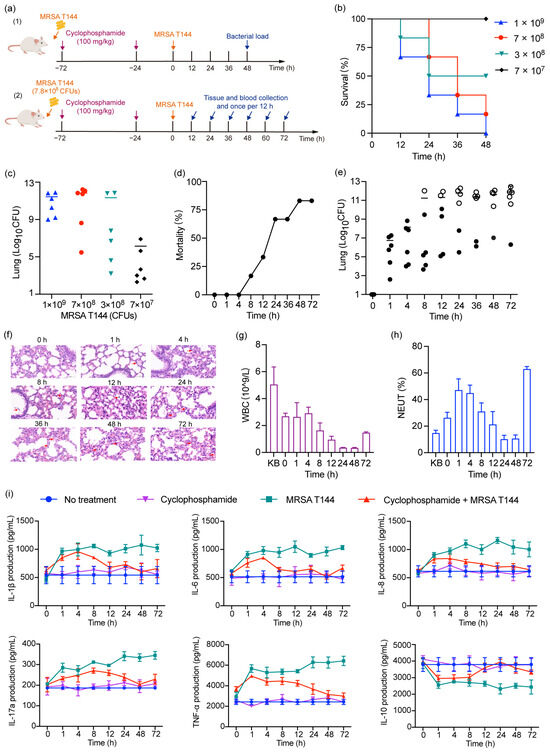 Mice were divided into four groups, including the no treatment group, the cyclophosphamide-only group, the MRSA T144 infection group, and the cyclophosphamide plus MRSA T144 infection group. Each group included three mice per time point, with a total of nine time points. Mice in the cyclophosphamide group and the cyclophosphamide plus MRSA T144 infection group received an intraperitoneal injection of cyclophosphamide (100 mg/kg) 24 h and 72 h prior to infection with MRSA, respectively. Mice in the MRSA T144 infection group and the cyclophosphamide plus MRSA T144 infection group were infected via nasal drip with 7.8 × 108 CFUs per mouse. Serum and lung tissues were collected at 0, 1, 4, 8, 12, 24, 48, and 72 h after infection. Orbital venous blood collection was centrifuged at 4000× g for 30 min, and the supernatant was collected and used to determine the concentrations of inflammatory factors in the serum. Meanwhile, lung tissues were ground in liquid nitrogen to prepare a homogenate, adjusted to a certain concentration, for the detection of the concentrations of inflammatory factors in the lung. The concentrations of IL-1β, IL-6, IL-8, IL-10, IL-17a, and TNF-α were analyzed using ELISA kits (Nanjing Jiancheng Bioengineering Institute, Nanjing, China).